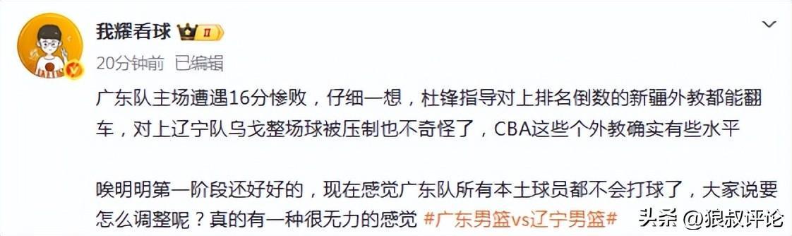博主我耀打球发文点评:广东队主场遭遇16分惨败,仔细一想,杜锋指导对上排名倒数的新疆外教都能翻车,对上辽宁队乌戈整场球被压制也不奇怪了,CBA这些个外教确实有些水平